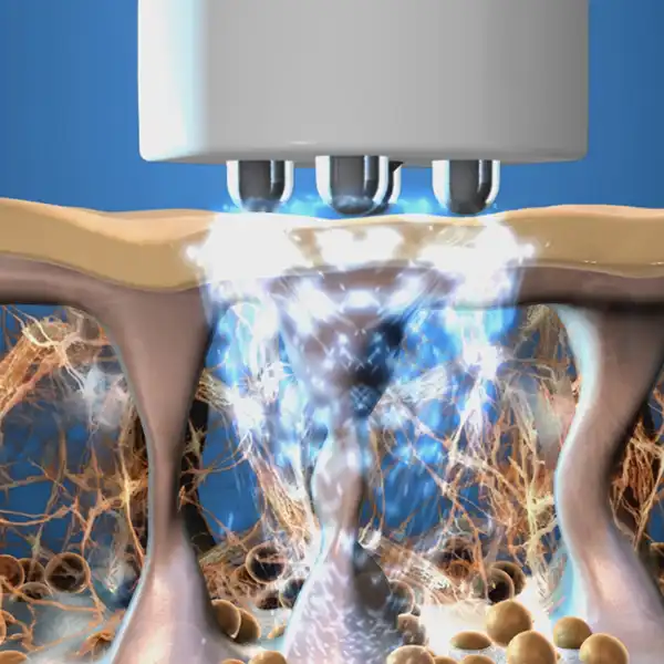 Sind ultrafeine Elektroden (Nädelchen), welche gleichzeitig mit der Radiofrequenz eingesetzt werden. Diese bilden kontrollierte Kanäle in der Tiefe der Dermis und aktivieren dadurch den Repairmechanismus. Dies fördert neues Volumen in der Dermis, plostert eingefallene Zonen auf und glättet Falten.